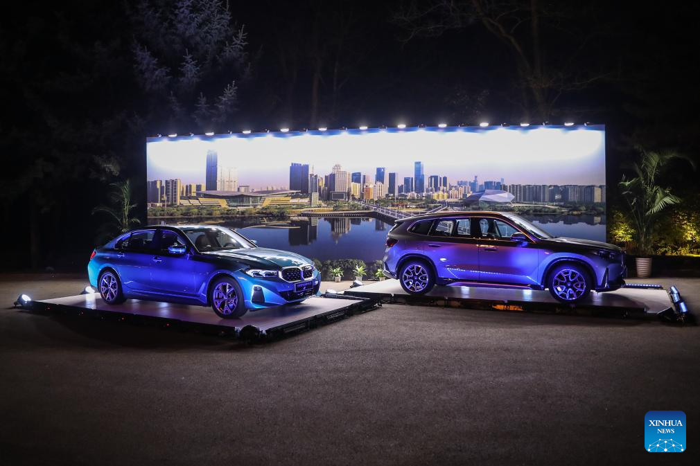 This photo taken on April 26, 2024 shows BMW electric vehicles displayed at the signing ceremony for deepening strategic cooperation between BMW and Shenyang, in Shenyang, northeast China's Liaoning Province. German carmaker BMW announced on Friday an additional investment of 20 billion yuan (about 2.81 billion U.S. dollars) in its production base in Shenyang, capital of northeast China's Liaoning Province. (Xinhua/Pan Yulong)
