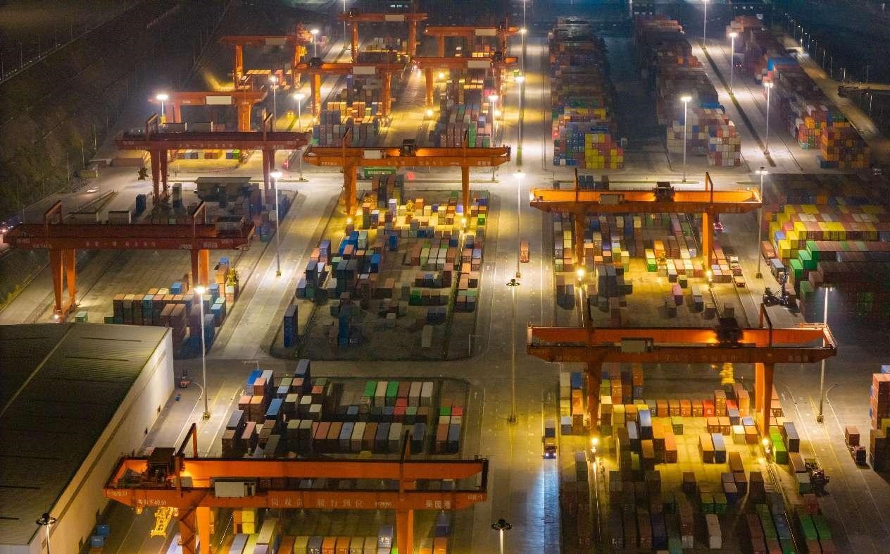 Photo shows a night view of a container terminal of the Guoyuan Port in southwest China's Chongqing municipality. (People's Daily Online/Li Hongbo)