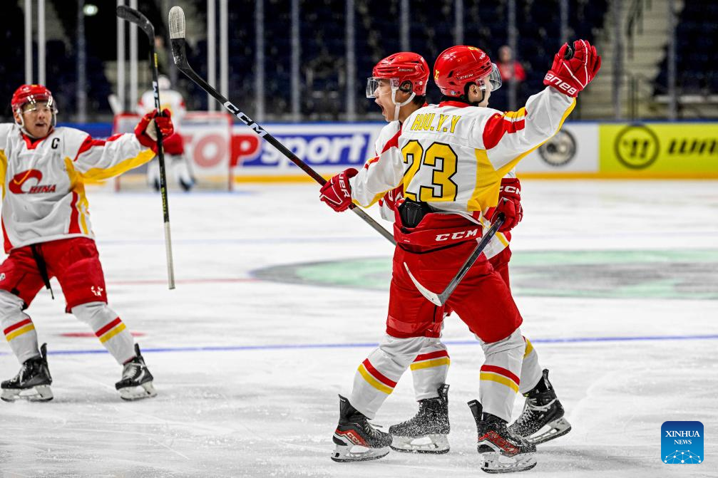 China's Hou Yuyang (front) celebrate scoring with teammates during the match between China and the Netherlands at the 2024 IIHF Ice Hockey World Championship Division I-B in Vilnius, Lithuania, April 27, 2024. (Photo by Alfredas Pliadis/Xinhua)