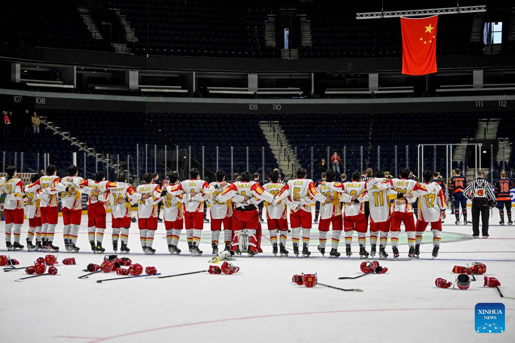 China's players line up and celebrate the victory after the match between China and the Netherlands at the 2024 IIHF Ice Hockey World Championship Division I-B in Vilnius, Lithuania, April 27, 2024. (Photo by Alfredas Pliadis/Xinhua)