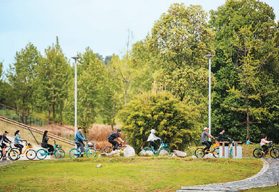 Citizens enjoy cycling along a greenway in Chengdu, capital of southwest China's Sichuan Province. (Photo/Li Dong)