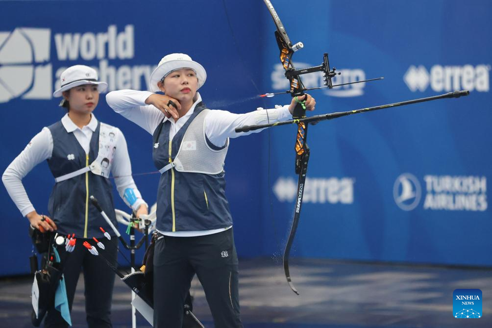 Lim Sihyeon (R) of team South Korea competes during the Women's Recurve Team Final between China and South Korea at Shanghai 2024 Archery World Cup Stage 1 in Shanghai, China, April 28, 2024. (Xinhua/Wang Xiang)