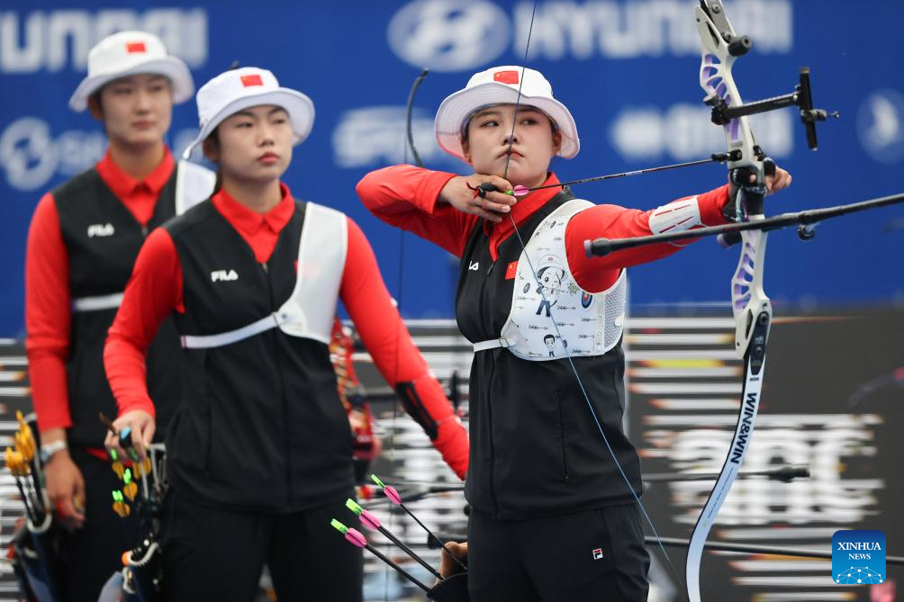 An Qixuan of team China competes during the Women's Recurve Team Final between China and South Korea at Shanghai 2024 Archery World Cup Stage 1 in Shanghai, China, April 28, 2024. (Xinhua/Wang Xiang)