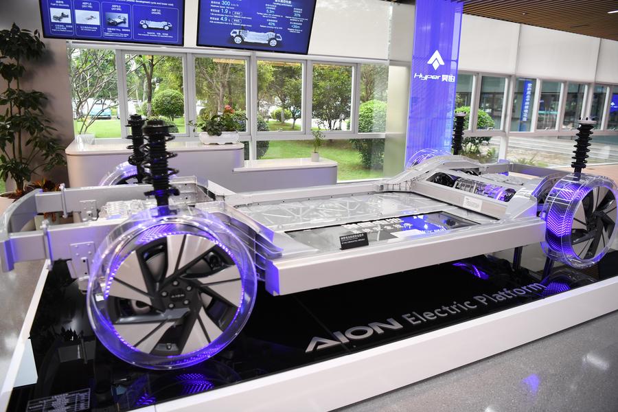 This photo taken on April 24, 2024 shows an electric platform model of GAC Aion New Energy Automobile Co., Ltd. in Guangzhou, south China's Guangdong Province. (Xinhua/Deng Hua)