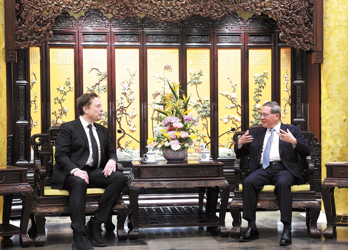Premier Li Qiang meets on Sunday with Elon Musk, founder and CEO of US electric car manufacturer Tesla, at Diaoyutai Guest House in Beijing. [FENG YONGBIN / CHINA DAILY]