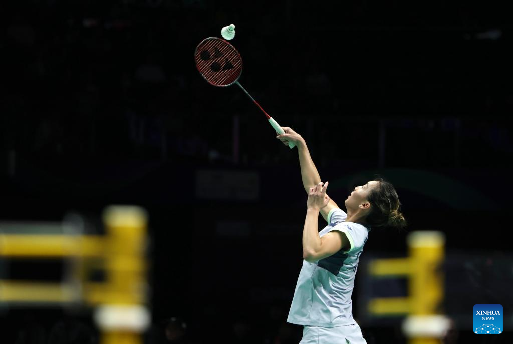 Michelle Li of Canada hits a return in the singles match against He Bingjiao of China during the group A match between China and Canada at BWF Uber Cup Finals in Chengdu, southwest China's Sichuan Province, April 28, 2024. (Xinhua/Chen Bin)