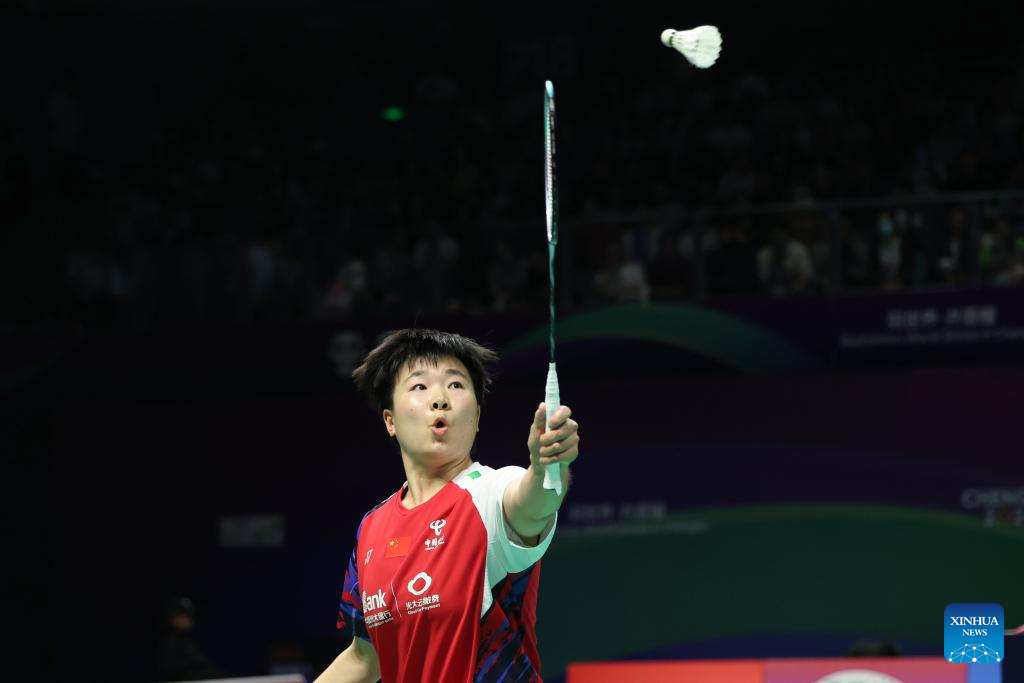He Bingjiao of China hits a return in the singles match against Michelle Li of Canada during the group A match between China and Canada at BWF Uber Cup Finals in Chengdu, southwest China's Sichuan Province, April 28, 2024. (Xinhua/Chen Bin)