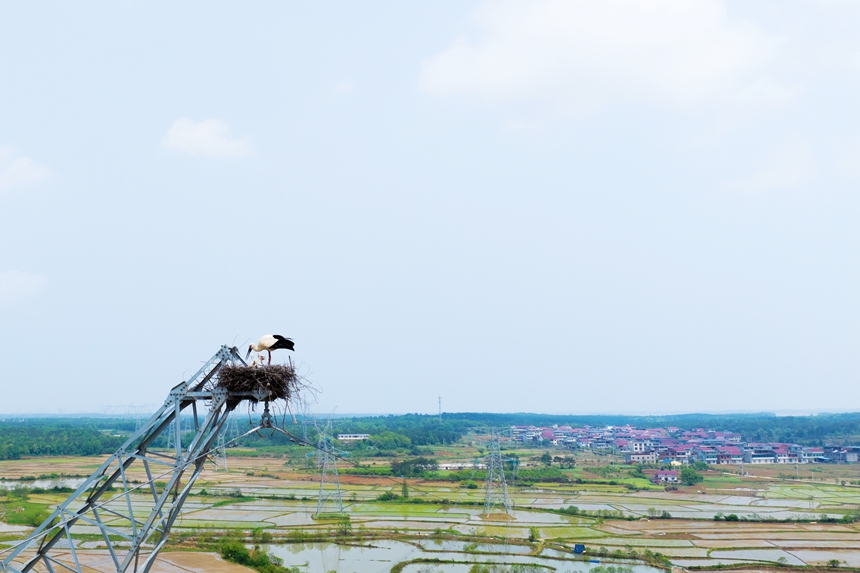 Oriental storks, an endangered bird species under first-class national protection in China, settle in an artificial nest built on an electricity pylon by State Grid Jiangxi Electric Power Co., Ltd., a subsidiary of the State Grid Corporation of China in east China's Jiangxi Province. ?(Photo/Fu Jie)