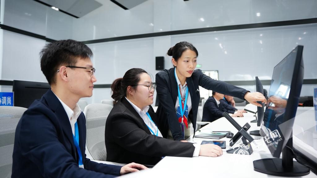 Staff members work at the digital urban operation and governance center of Jiulongpo district, southwest China's Chongqing municipality. (Photo from cqnews.net)
