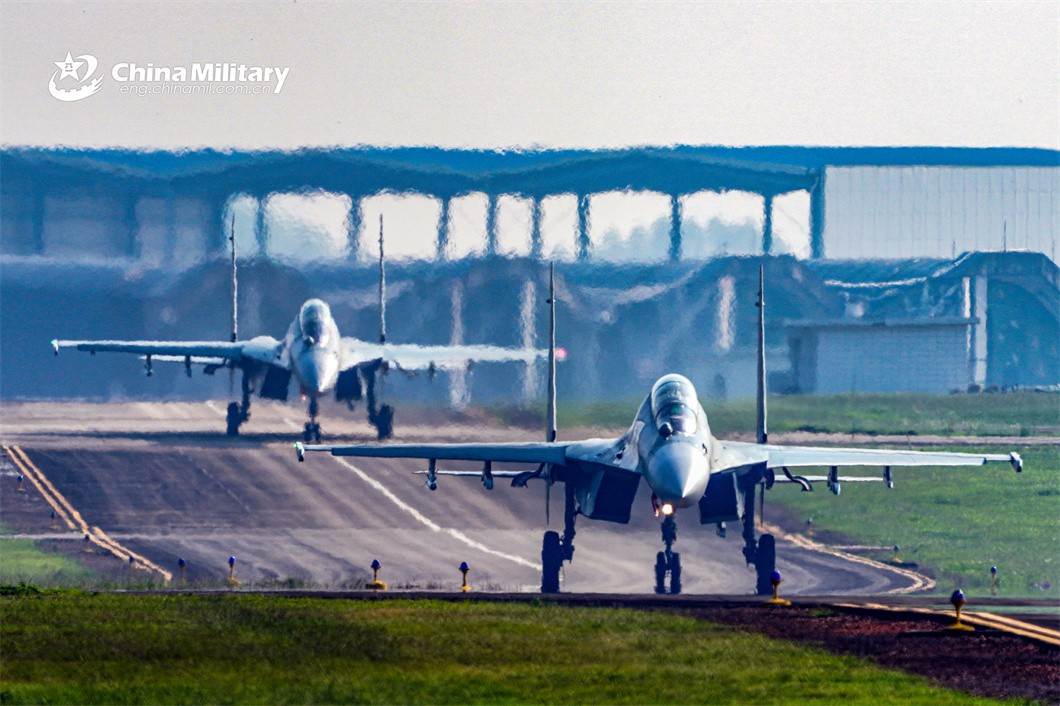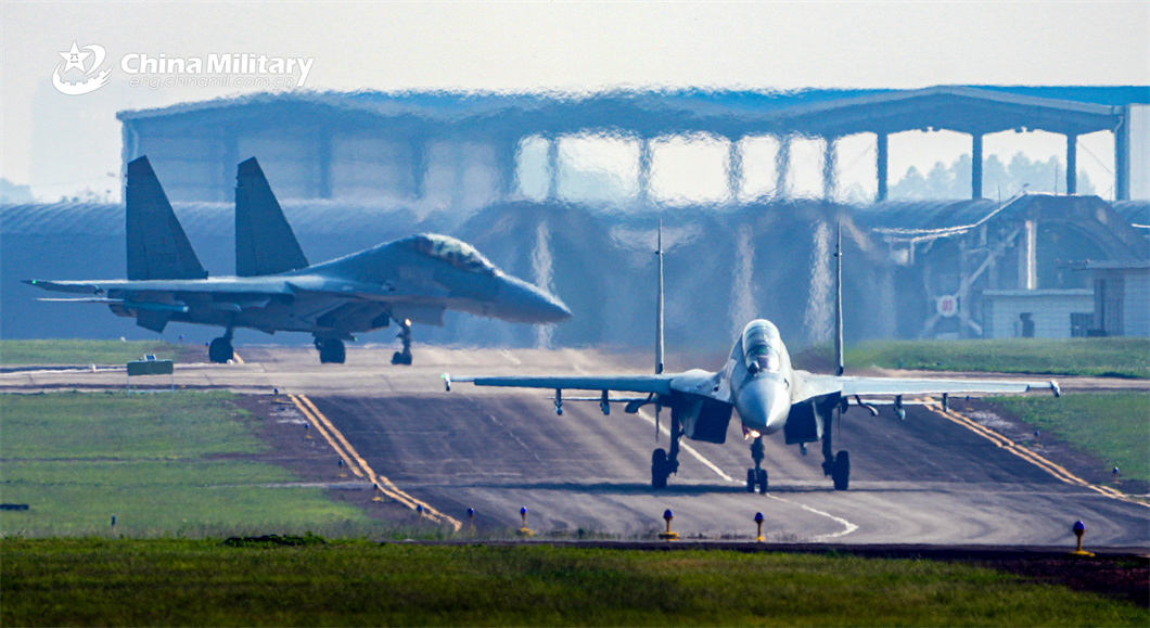 Fighter jets attached to an aviation brigade with the air force under the PLA Southern Theater Command taxi on the runway in formation during a flight training exercise on April 19, 2024. (eng.chinamil.com.cn/Photo by Zhao Yutong)