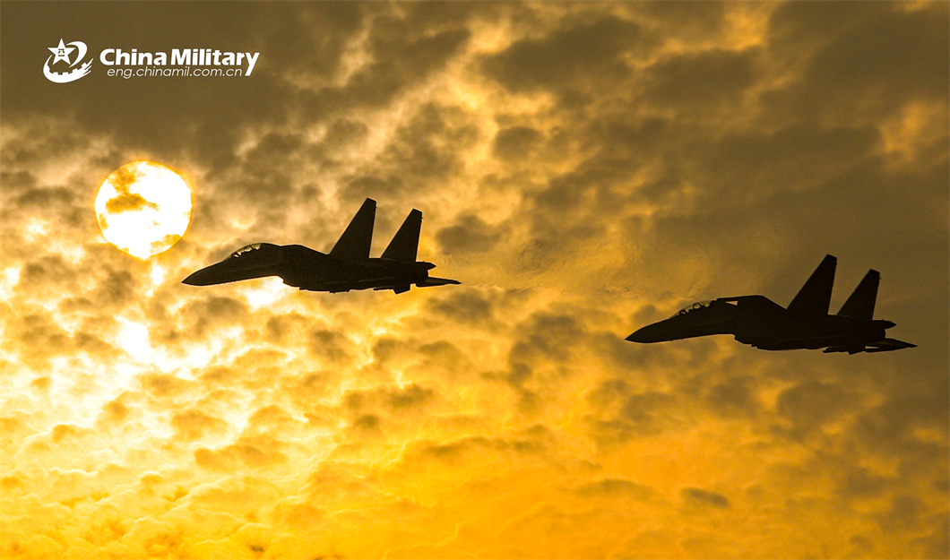 Fighter jets attached to an aviation brigade with the air force under the PLA Southern Theater Command fly in formation at sunset during a flight training exercise on April 19, 2024. (eng.chinamil.com.cn/Photo by Zhao Yutong)