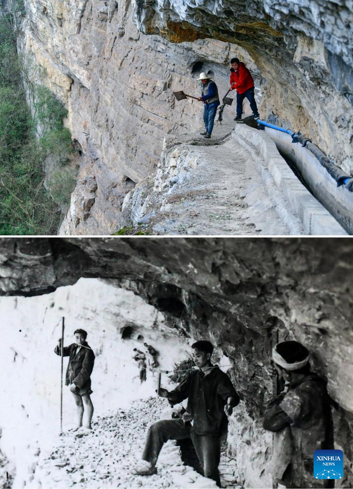 This combo photo shows members of a canal maintenance team patrolling a canal on the cliffs on April 24, 2024 (L, photo by Xinhua photographer Yang Wenbin), and members of a canal construction team building a canal on the cliffs in 1960 (R, photo by Wang Zhenxiang), in Shengji Township of Bijie City, southwest China's Guizhou Province.