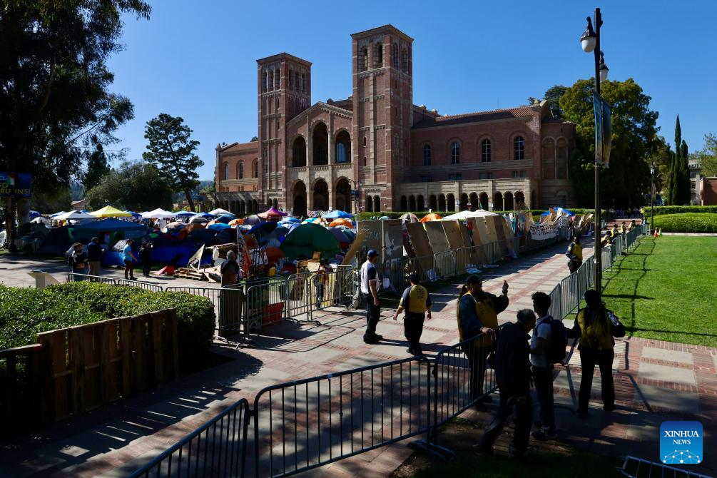 In this photo taken on April 28, 2024, the pro-Palestine encampment on school campus is closed and all entrances to that area are blocked at the University of California, Los Angeles (UCLA), in California, the United States. (Xinhua)