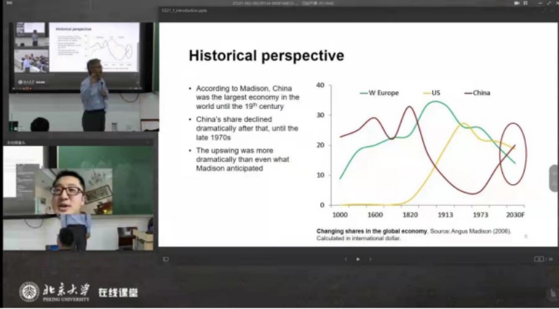 Professor Huang Yiping gives an online class on Chinese economy on the campus of Peking University. The class is joined by 70 students from 27 universities on five continents. (Photo from the public account of ClassIn on WeChat)