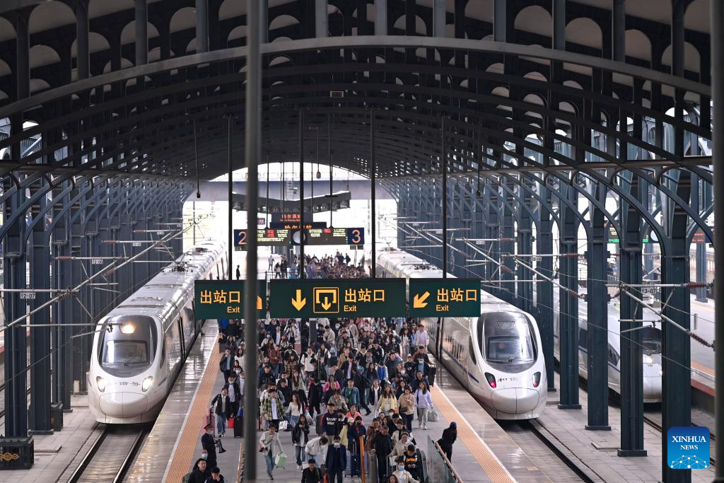 Passengers board a train at Nanjing Railway Station in Nanjing, capital of east China's Jiangsu Province, on April 30, 2024. China's railway network is expected to handle 144 million passenger trips during the eight-day May Day holiday travel rush, the China State Railway Group Co., Ltd. said Monday. (Photo by Su Yang/Xinhua)