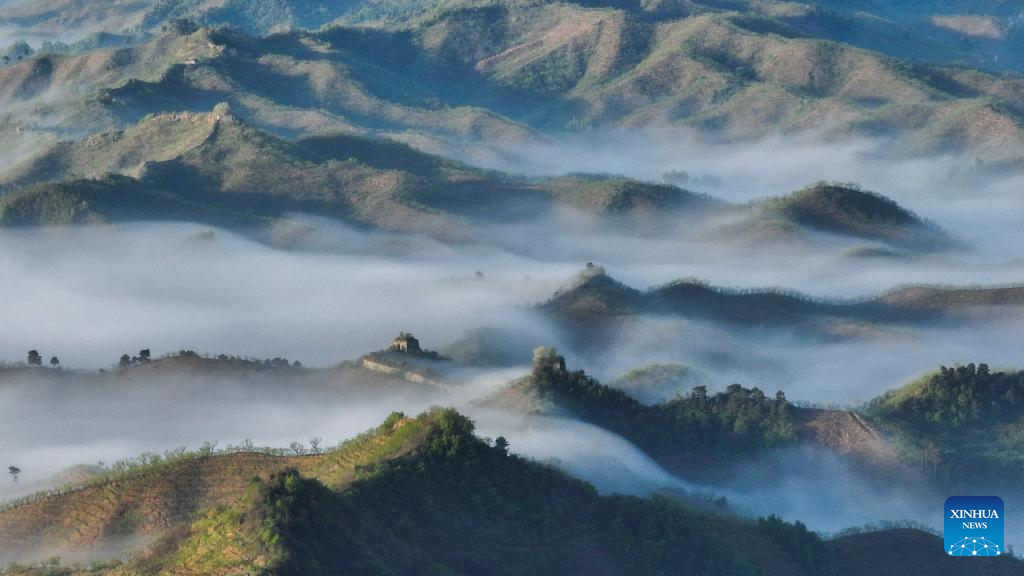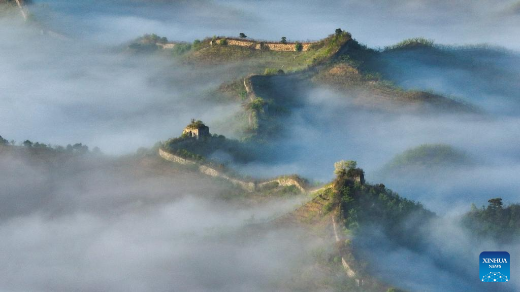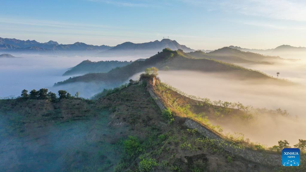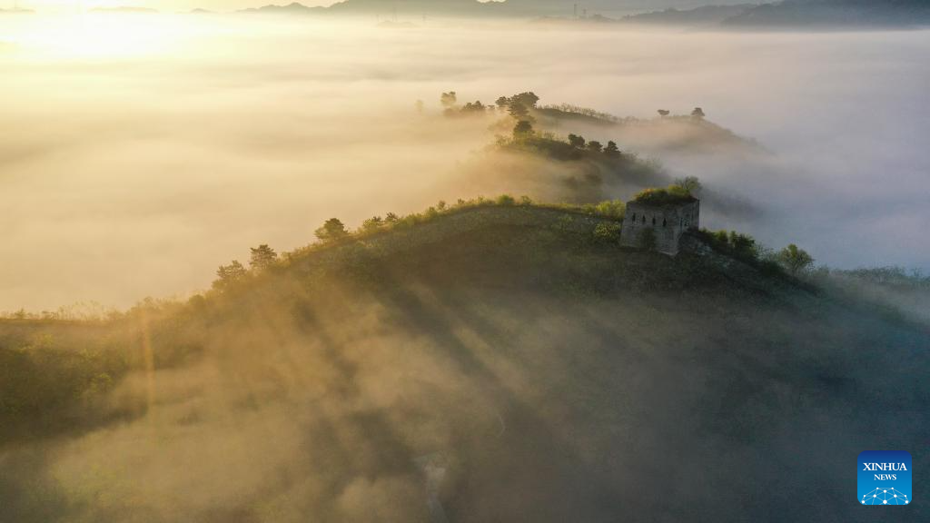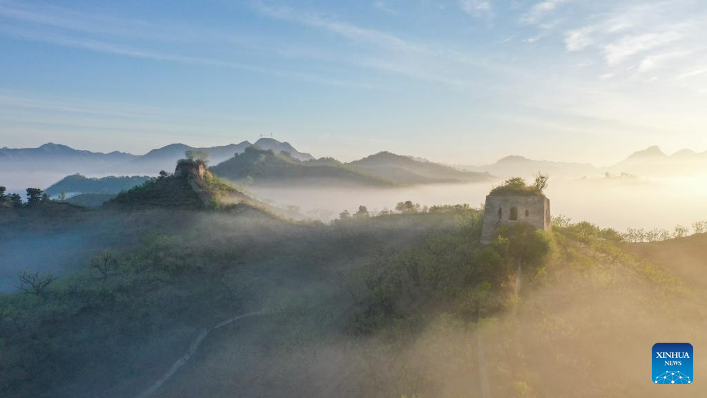 An aerial drone photo taken on April 30, 2024 shows a scenery of Hongshankou Great Wall in Xiaochang Township of Zunhua City, north China's Hebei Province. (Photo by Liu Mancang/Xinhua)