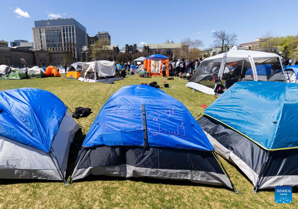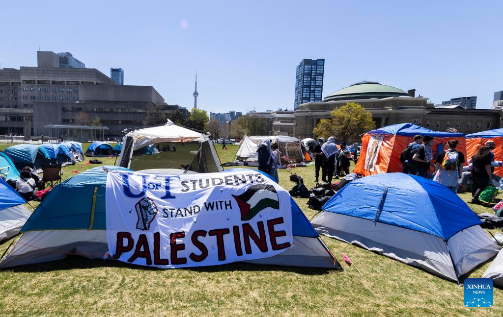 Pro-Palestinian demonstrators are seen in an encampment of tents at St. George Campus of the University of Toronto in Toronto, Canada, on May 2, 2024. (Photo by Zou Zheng/Xinhua)