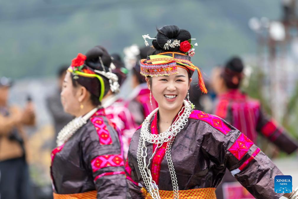People of Miao ethnic group perform Lusheng dance at a plaza in Jianhe County, southwest China's Guizhou Province, May 1, 2024. (Photo by Fan Hui/Xinhua)