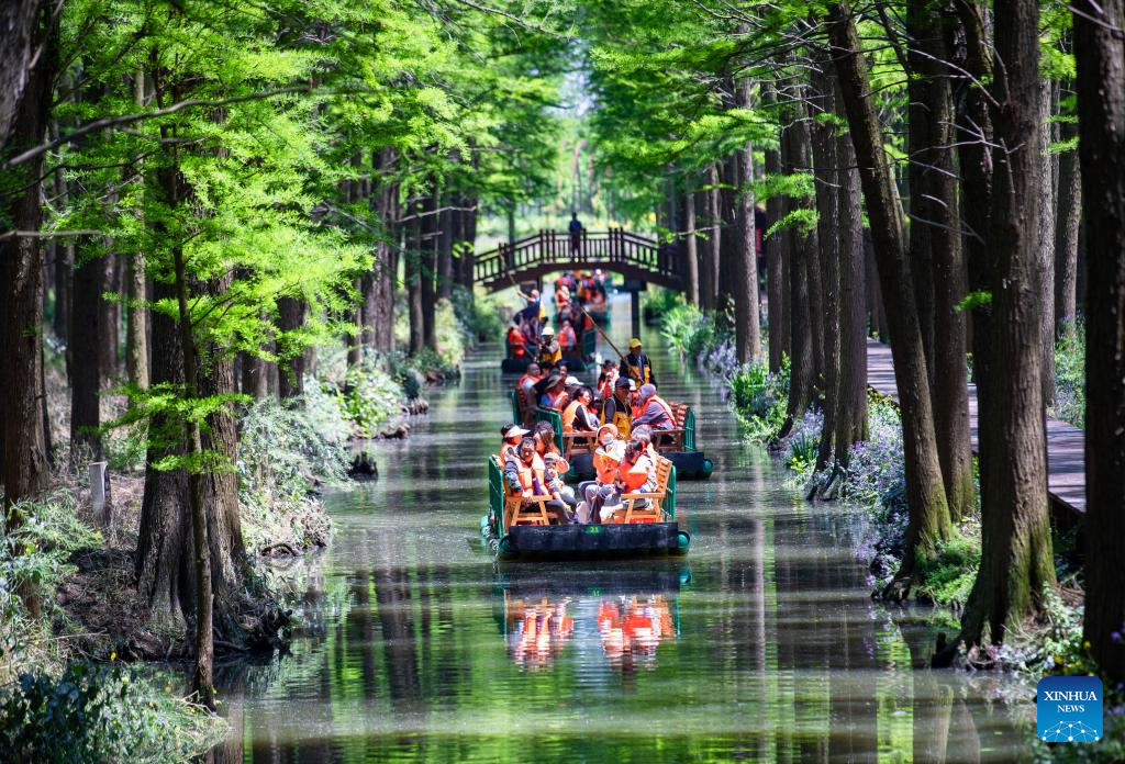 Tourists visit a national wetland park in Xinghua, east China's Jiangsu Province, May 1, 2024. (Photo by Zhou Shegen/Xinhua)