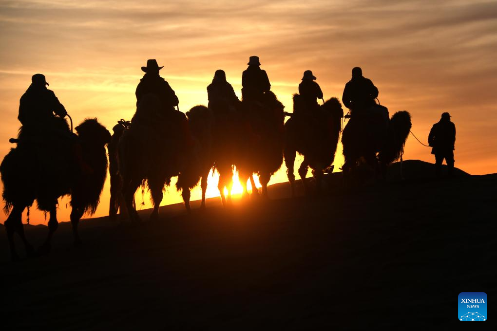 Tourists visit the Mingsha Mountain and Crescent Spring scenic spot in the city of Dunhuang, northwest China's Gansu Province, May 1, 2024. (Photo by Zhang Xiaoliang/Xinhua)