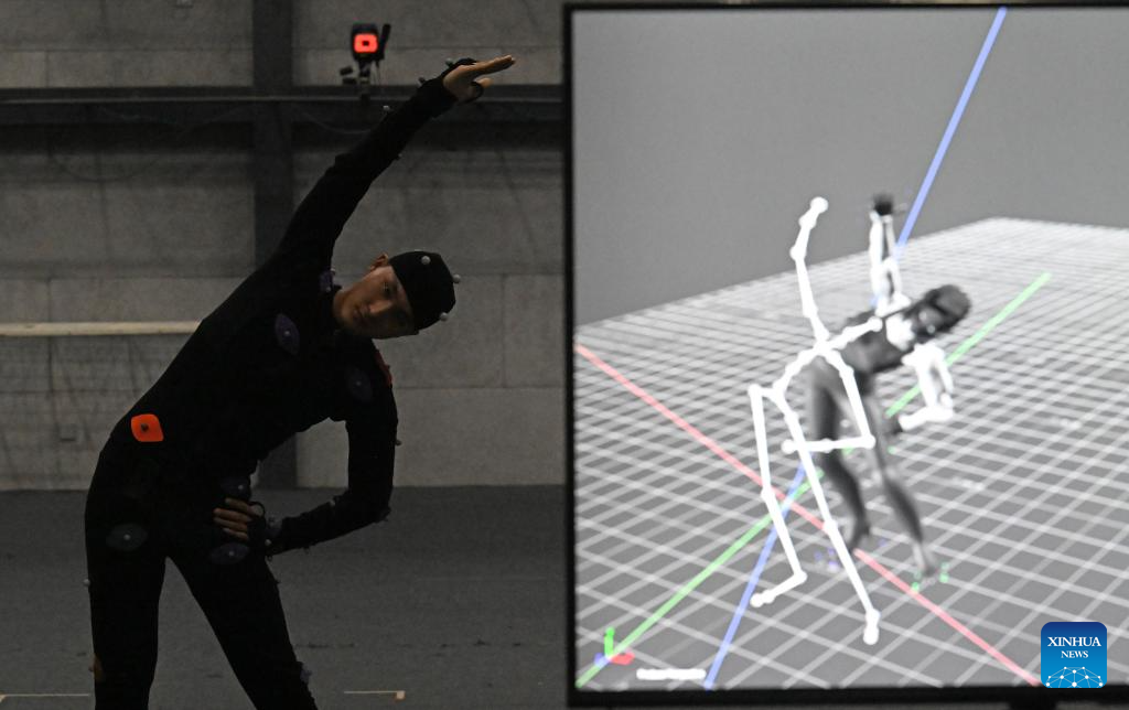 Ma Xinqi performs at a motion capture booth in the National Animation Industry Park in Binhai New Area, north China's Tianjin Municipality, April 23, 2024. (Xinhua/Zhao Zishuo)