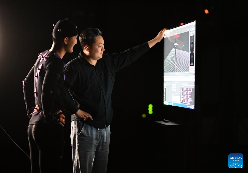 Cui Shengji (R) and Ma Xinqi watch movements of a visual character at a motion capture booth in the National Animation Industry Park, Binhai New Area, north China's Tianjin Municipality, April 23, 2024. Surrounded by dozens of high-definition infrared cameras, Ma Xinqi, a motion capture actor, performs in a booth while a visual character on the computer screen records and repeats his movements.