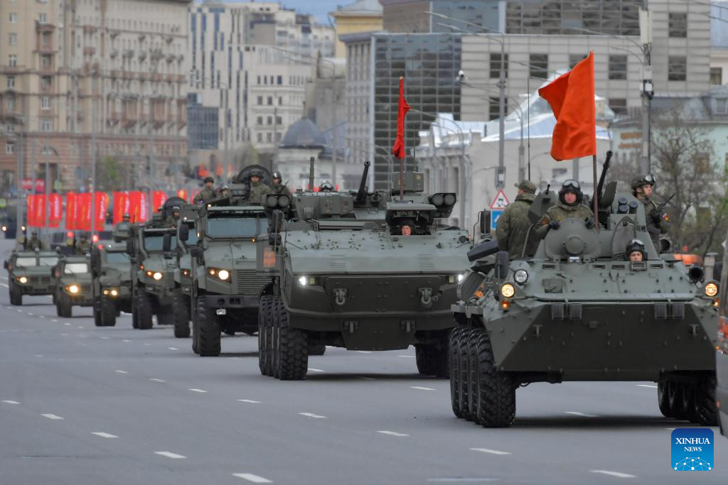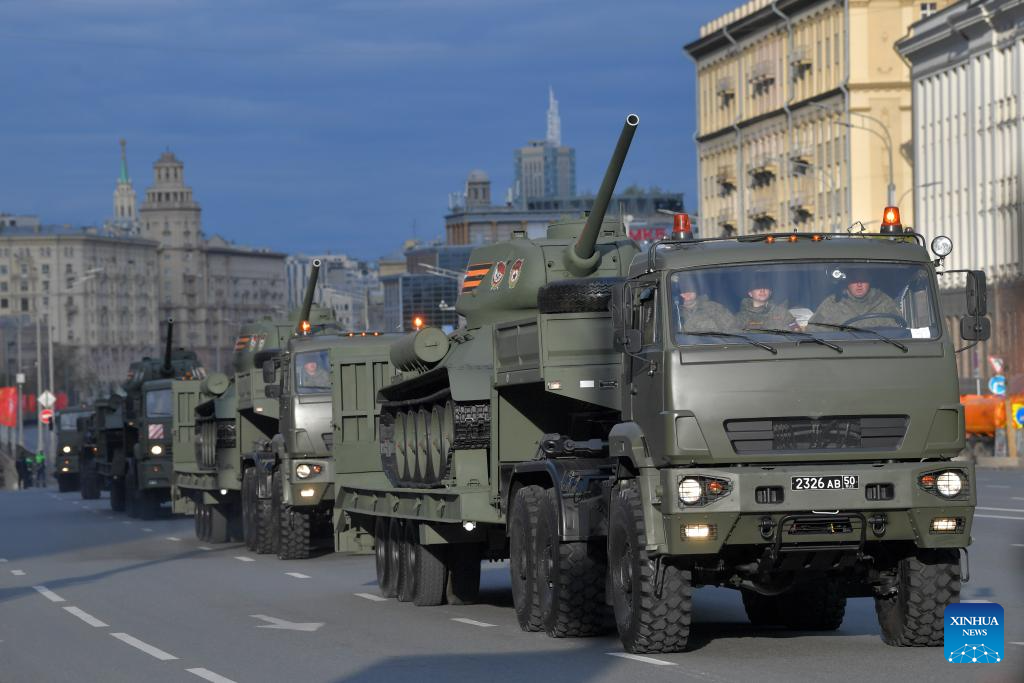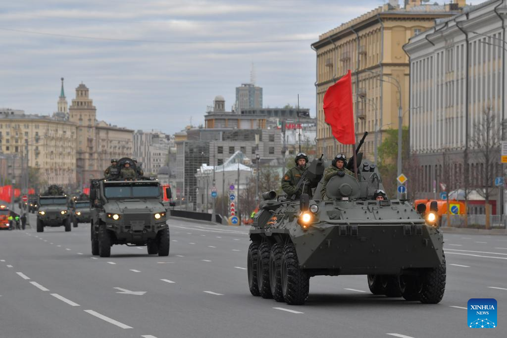 Russian military vehicles drive along a street to attend a rehearsal for the Victory Day military parade in Moscow, Russia, on May 2, 2024. (Photo by Alexander Zemlianichenko Jr/Xinhua)