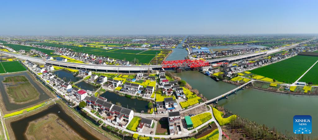 An aerial drone photo taken on March 29, 2024 shows a construction site on the expressway linking east China's Shanghai and northwest China's Shaanxi Province. (Xinhua/Ji Chunpeng)