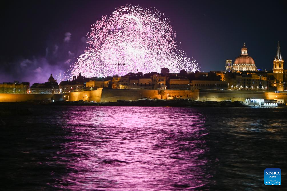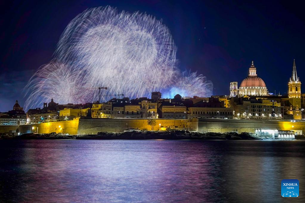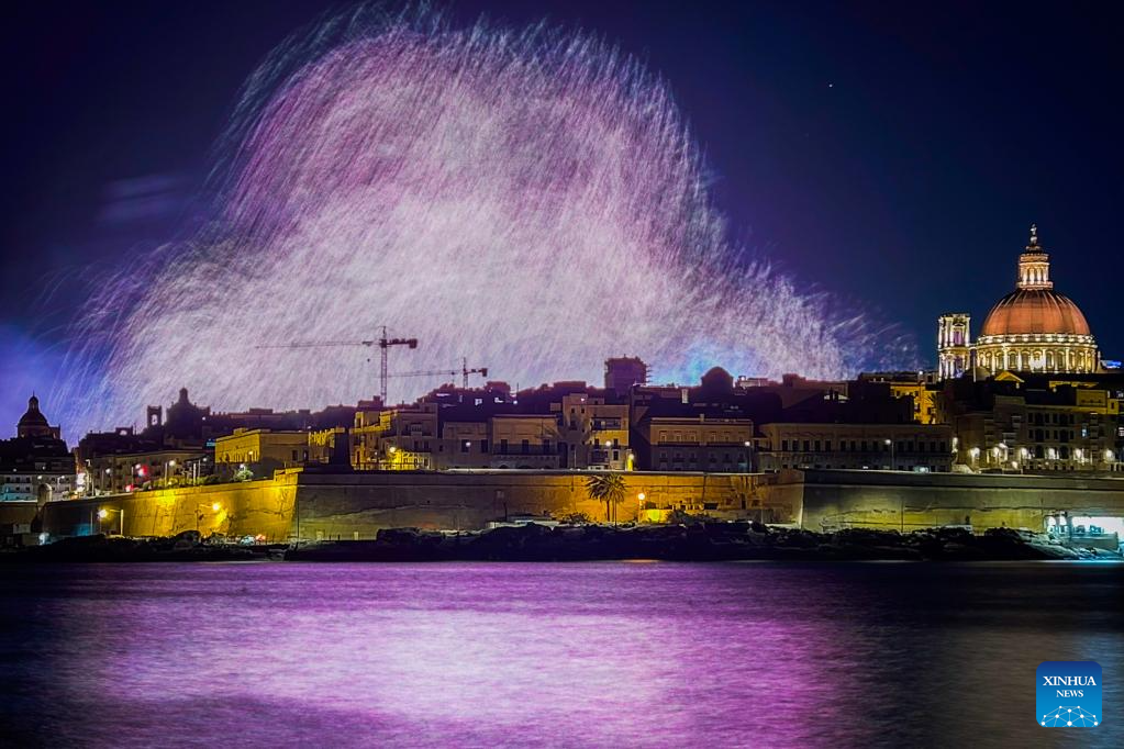 This photo taken on May 3, 2024 from Sliema, Malta shows fireworks during the grand finale of the Malta International Fireworks Festival. The annual fireworks festival kicked off here on April 20. (Photo by Jonathan Borg/Xinhua)