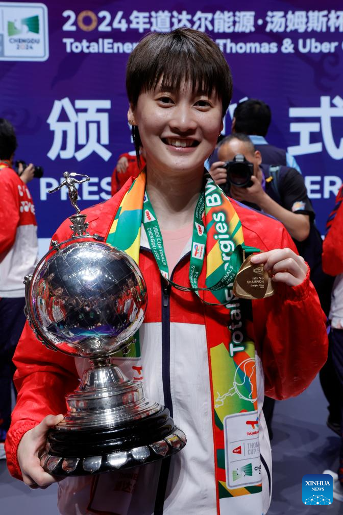 Chen Yufei of Team China poses with trophy after the awarding ceremony of the BWF Uber Cup Finals in Chengdu, southwest China's Sichuan Province, May 5, 2024. (Xinhua/Shen Bohan)
