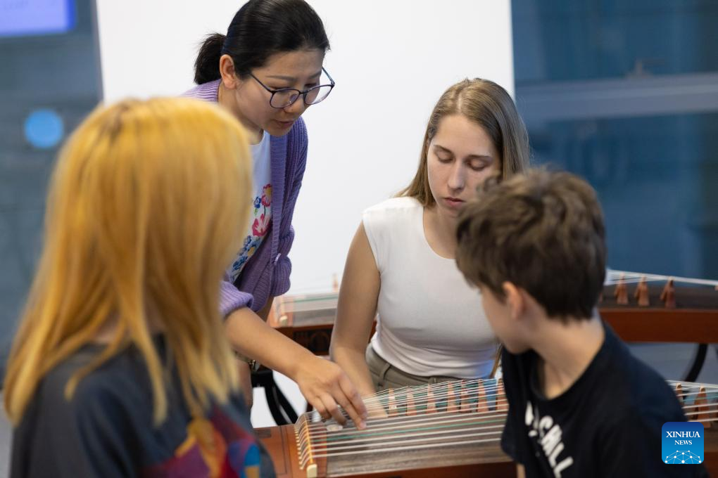A teacher (rear) instructs during a guzheng (a traditional Chinese musical instrument) class at the China Cultural Center in Belgrade, Serbia, April 29, 2024. The China Cultural Center in Belgrade, jointly built by China's Ministry of Culture and Tourism and the provincial government of Shandong, opened to the public recently. The center covers an area of 6,000 square meters and offers classes on Chinese language, traditional Chinese musical instruments, Chinese calligraphy, and Tai Chi. (Xinhua/Li Jing)