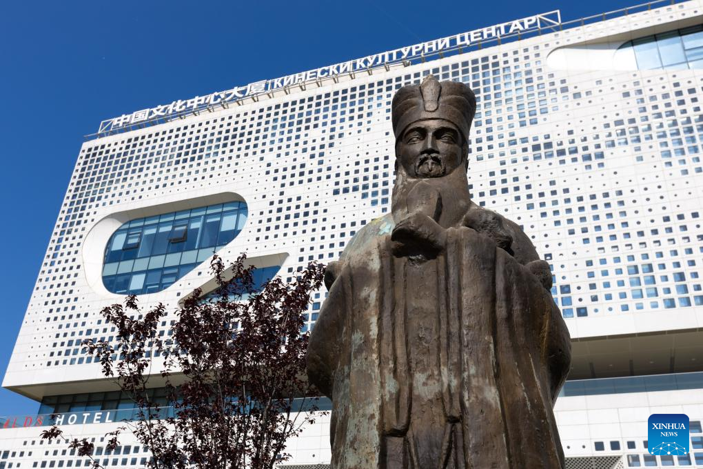 This photo taken on May 5, 2024 shows the statue of Confucius in front of the China Cultural Center in Belgrade, Serbia. The China Cultural Center in Belgrade, jointly built by China's Ministry of Culture and Tourism and the provincial government of Shandong, opened to the public recently. The center covers an area of 6,000 square meters and offers classes on Chinese language, traditional Chinese musical instruments, Chinese calligraphy, and Tai Chi. (Xinhua/Li Jing)