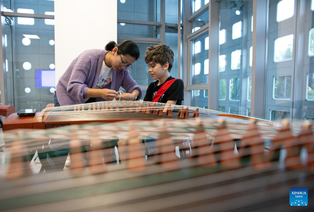 A student practices guzheng (Chinese zither) at the China Cultural Center in Belgrade, Serbia, April 29, 2024. The China Cultural Center in Belgrade, jointly built by China's Ministry of Culture and Tourism and the provincial government of Shandong, opened to the public recently. The center covers an area of 6,000 square meters and offers classes on Chinese language, traditional Chinese musical instruments, Chinese calligraphy, and Tai Chi. (Xinhua/Li Jing)