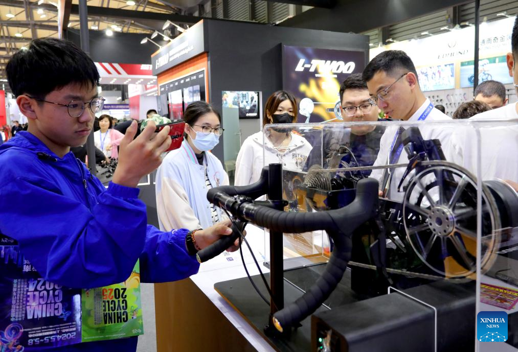 People visit the 32nd China International Bicycle Fair in east China's Shanghai, May 5, 2024. The event kicked off here on Sunday, drawing about 1,460 enterprises to participate. (Xinhua/Cai Yang)