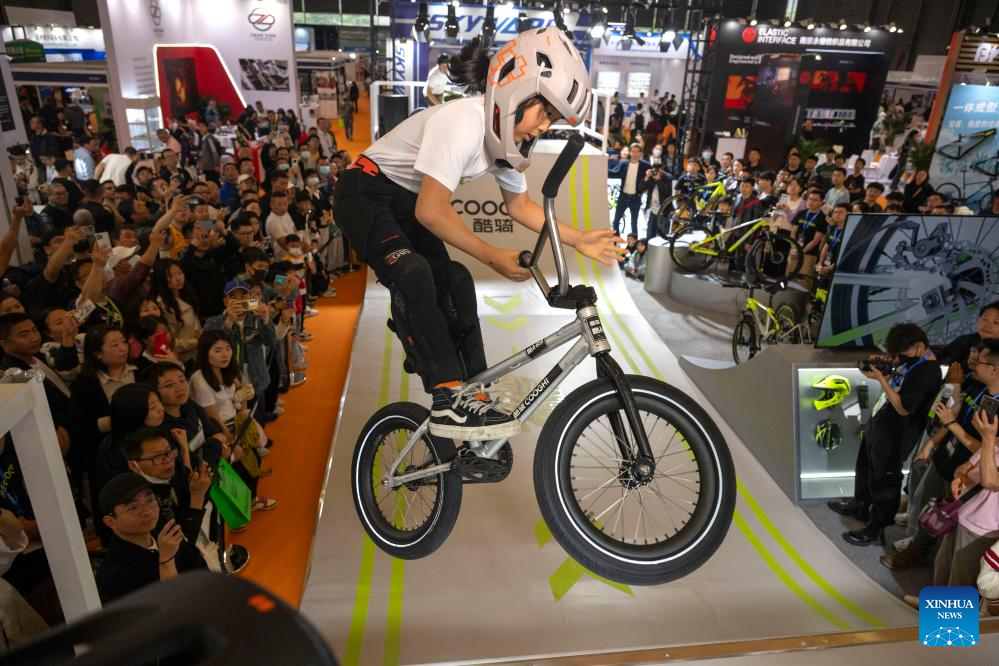 A young athlete performs bicycle stunt show during the 32nd China International Bicycle Fair in east China's Shanghai, May 5, 2024. The event kicked off here on Sunday, drawing about 1,460 enterprises to participate. (Xinhua/Fang Zhe)