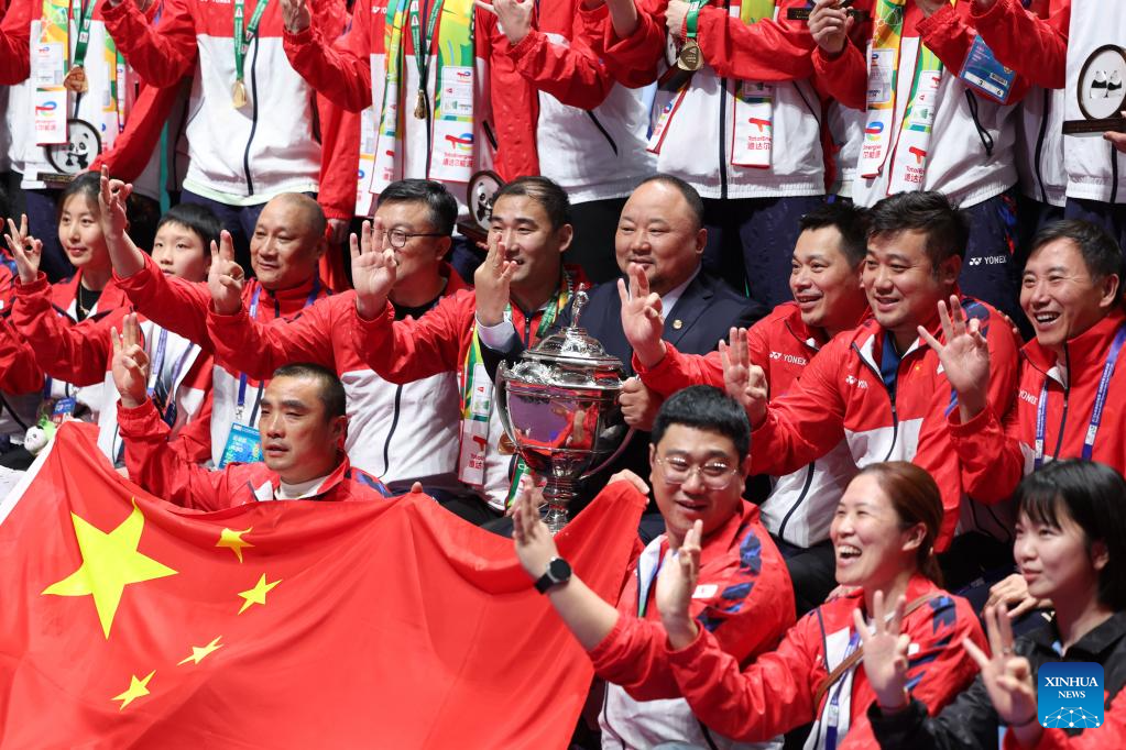 Team China pose with trophy after the awarding ceremony of the BWF Thomas Cup Finals in Chengdu, southwest China's Sichuan Province, May 5, 2024. (Xinhua/Chen Bin)