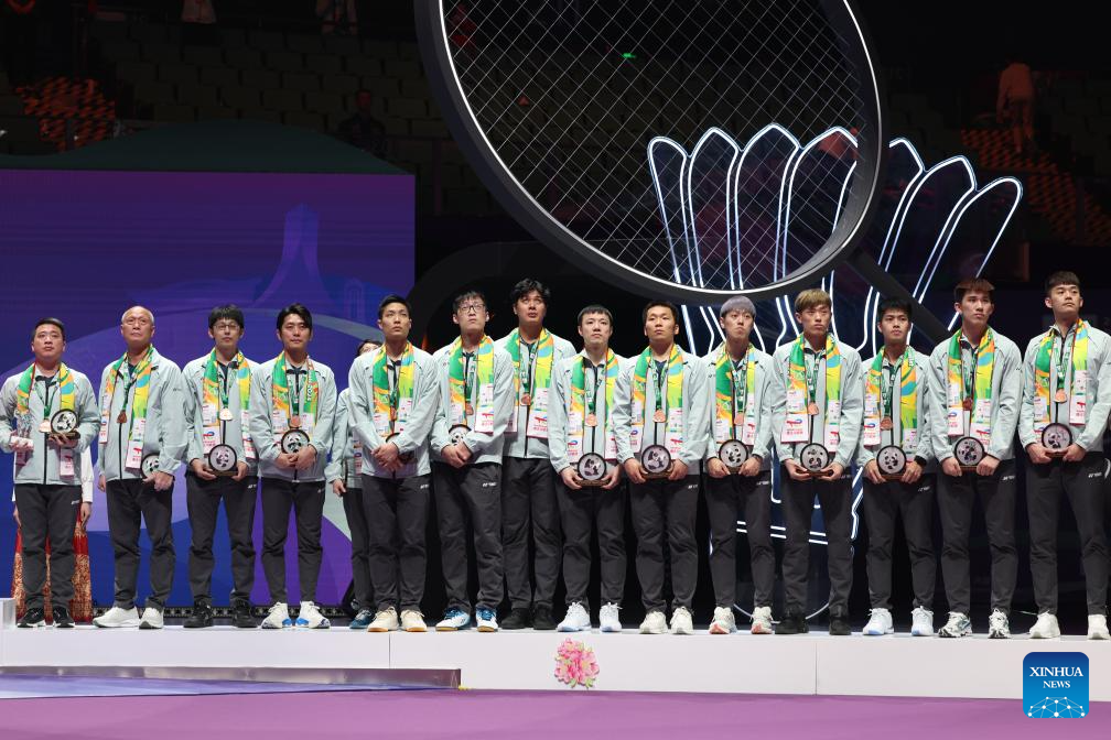 Team Chinese Taipei react during the awarding ceremony of the BWF Thomas Cup Finals in Chengdu, southwest China's Sichuan Province, May 5, 2024. (Xinhua/Chen Bin)