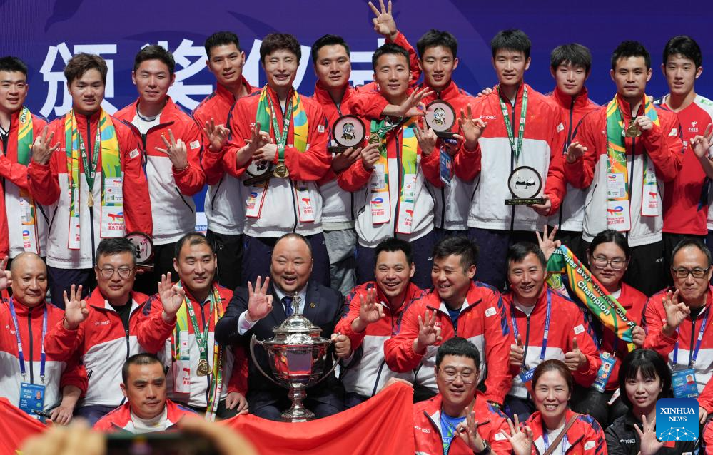 Team China pose for photograph after the awarding ceremony of the BWF Thomas Cup Finals in Chengdu, southwest China's Sichuan Province, May 5, 2024. (Xinhua/Jiang Hongjing)