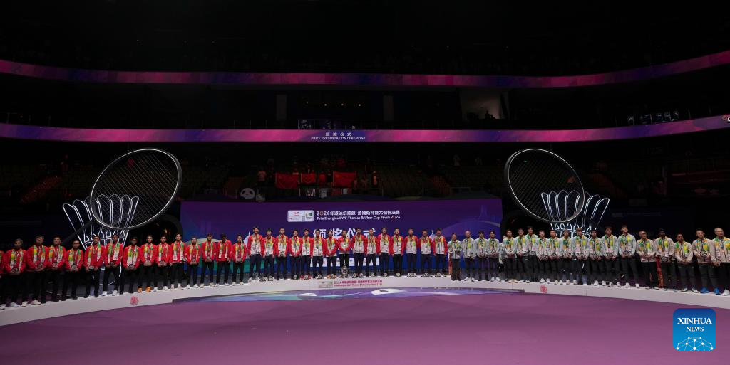 Medalists pose for photograph during the awarding ceremony of the BWF Thomas Cup Finals in Chengdu, southwest China's Sichuan Province, May 5, 2024. (Xinhua/Jiang Hongjing)
