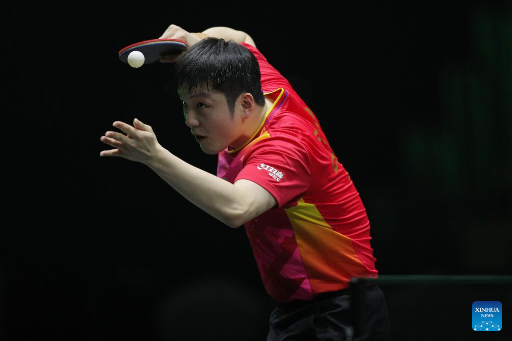 Fan Zhendong of China returns a shot during the men's singles round of 64 match against Nicolas Burgos of Chile at WTT Saudi Smash 2024 in Jeddah, Saudi Arabia, May 5, 2024. (Xinhua/WTT)