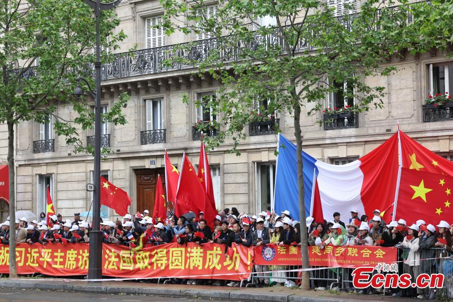 People gather on the streets of Paris waving Chinese and French flags to welcome Chinese President Xi Jinping in Paris, France, May 5, 2024. (Photo: China News Service/Sheng Jiapeng)
