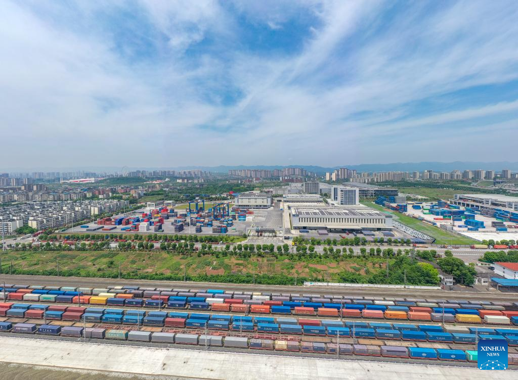 A China-Europe freight train waits to depart from the Tuanjiecun Station in the Chongqing International Logistics Hub Park in southwest China's Chongqing Municipality, May 5, 2024. The Chongqing International Logistics Hub Park, which includes the Tuanjiecun Station, the dry port of the New International Land-Sea Trade Corridor, and the Chongqing Railway Port, has risen to be a major hub of international freight trains in the country's western region. (Xinhua/Huang Wei)