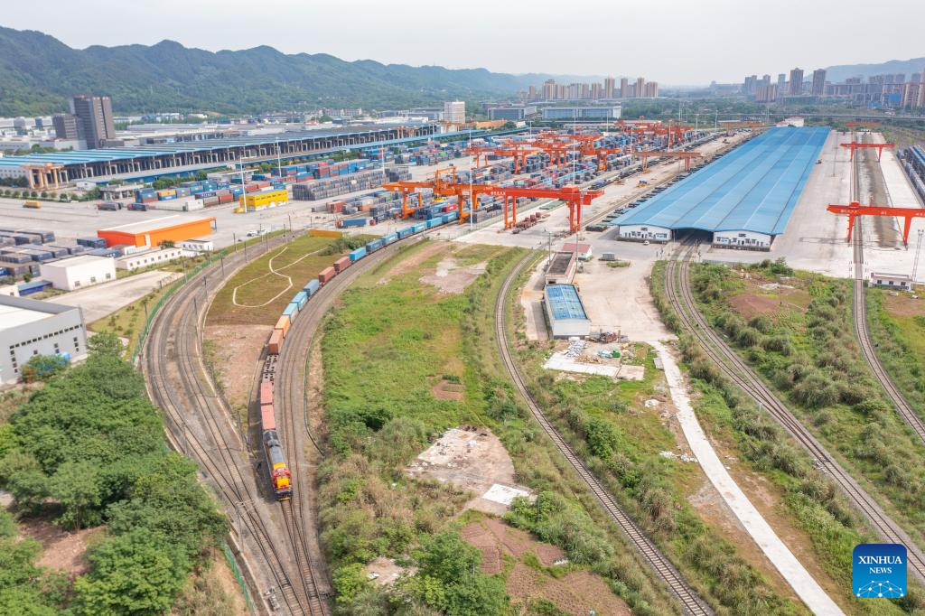 An aerial drone photo taken on May 5, 2024 shows a China-Europe freight train pulling out of the Tuanjiecun Station in the Chongqing International Logistics Hub Park in southwest China's Chongqing Municipality. The Chongqing International Logistics Hub Park, which includes the Tuanjiecun Station, the dry port of the New International Land-Sea Trade Corridor, and the Chongqing Railway Port, has risen to be a major hub of international freight trains in the country's western region. (Xinhua/Huang Wei)