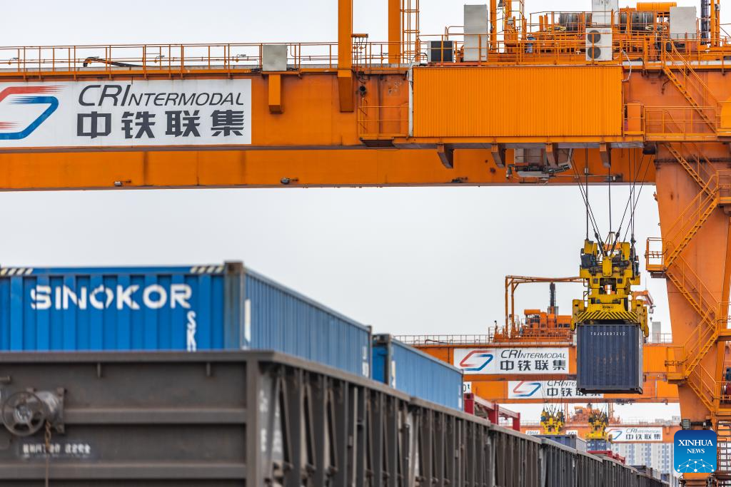 A China-Europe freight train is loaded at the Tuanjiecun Station in the Chongqing International Logistics Hub Park in southwest China's Chongqing Municipality, May 5, 2024. The Chongqing International Logistics Hub Park, which includes the Tuanjiecun Station, the dry port of the New International Land-Sea Trade Corridor, and the Chongqing Railway Port, has risen to be a major hub of international freight trains in the country's western region. (Xinhua/Huang Wei)