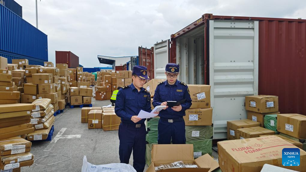 Customs officers check goods waiting to be exported via China-Europe freight trains at the Tuanjiecun Station in the Chongqing International Logistics Hub Park in southwest China's Chongqing Municipality, May 3, 2024. The Chongqing International Logistics Hub Park, which includes the Tuanjiecun Station, the dry port of the New International Land-Sea Trade Corridor, and the Chongqing Railway Port, has risen to be a major hub of international freight trains in the country's western region. (Xinhua/Huang Wei)
