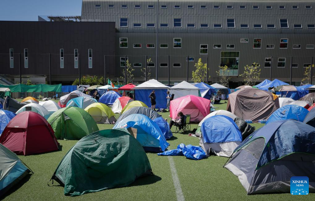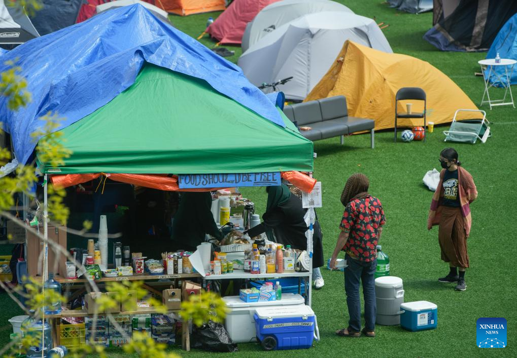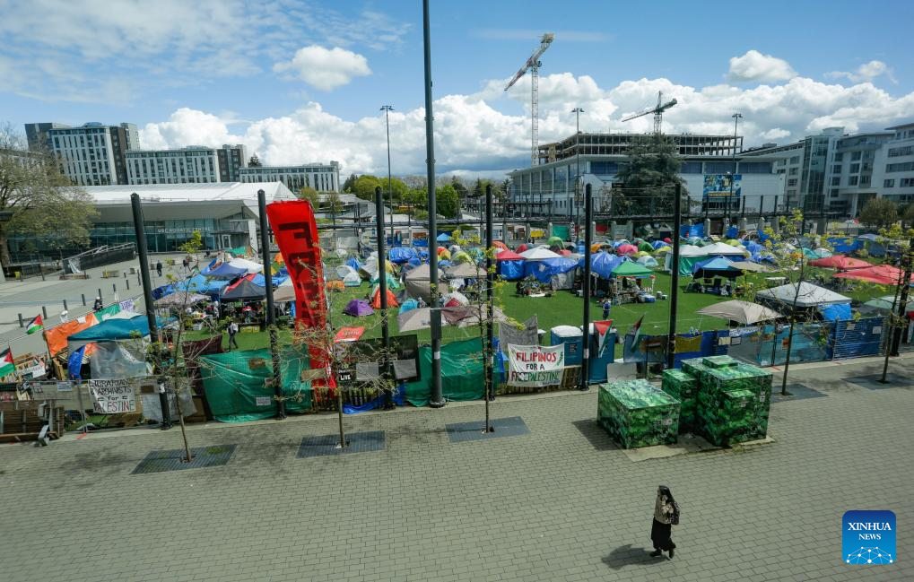 People are seen near an encampment on the Vancouver campus of the University of British Columbia in Vancouver, British Columbia, Canada, on May 6, 2024. (Photo by Liang Sen/Xinhua)
