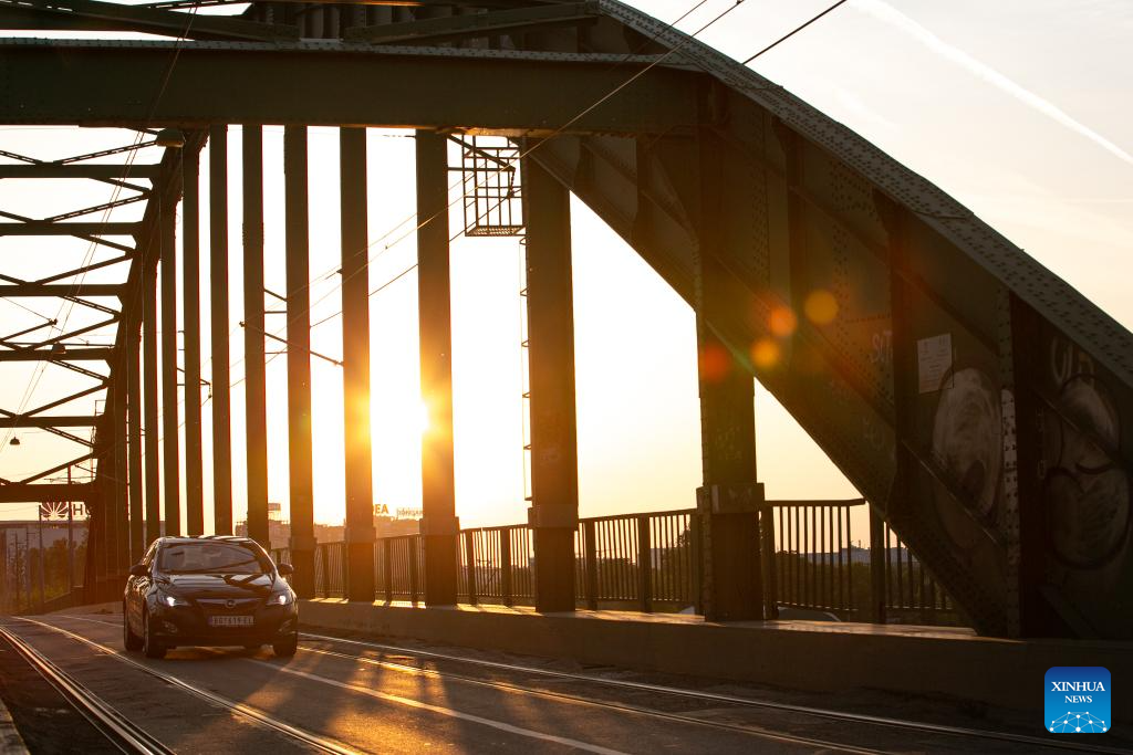 A car runs on the Old Sava Bridge in Belgrade, Serbia, May 4, 2024. (Xinhua/Li Jing)