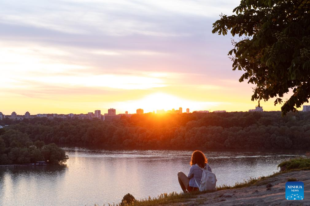 A woman watches sunset near the Sava River in Belgrade, Serbia, May 6, 2024. (Xinhua/Li Jing)