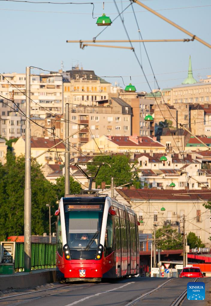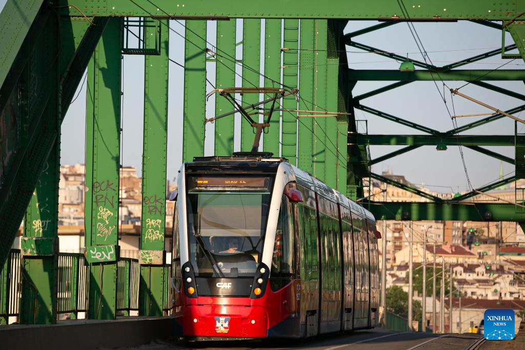 A tramcar runs on the Old Sava Bridge in Belgrade, Serbia, May 5, 2024. (Xinhua/Li Jing)