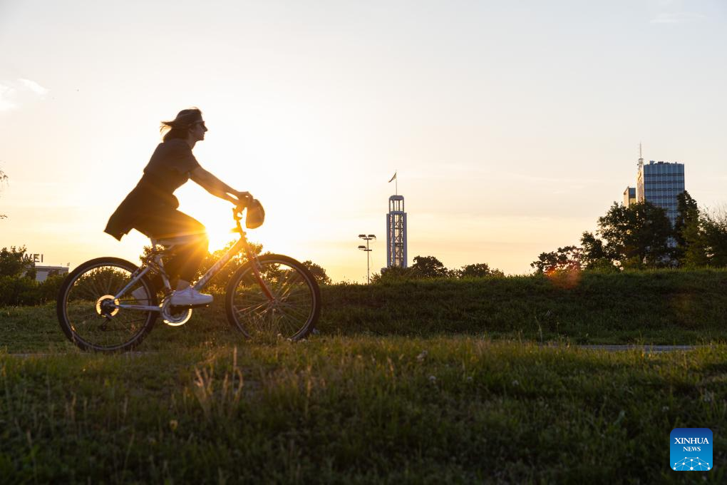 A woman rides a bike along the Sava River in Belgrade, Serbia, May 5, 2024. (Xinhua/Li Jing)